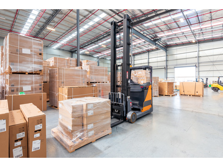 リーチリフトによる工業用部品(木箱)の入出荷作業になります。